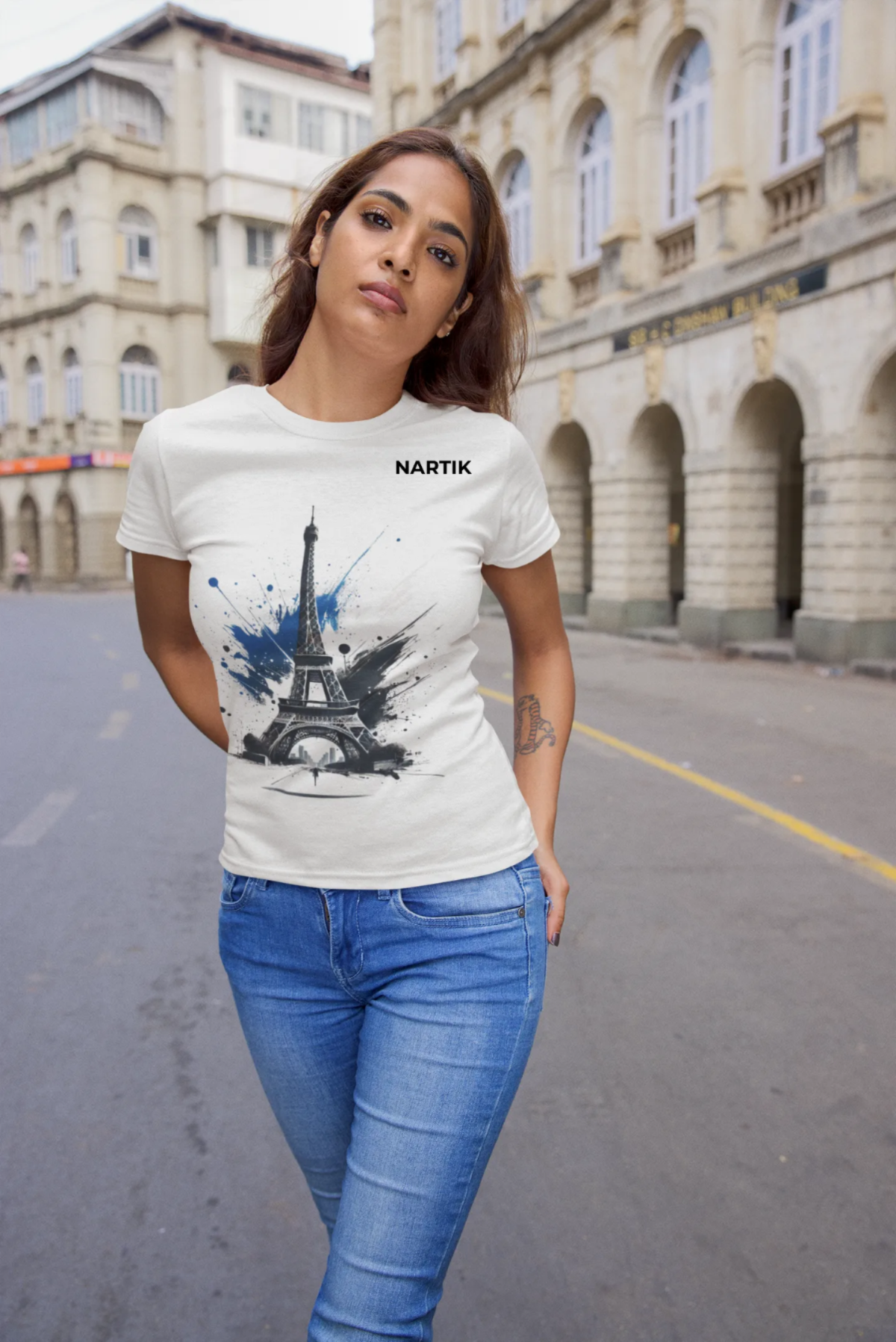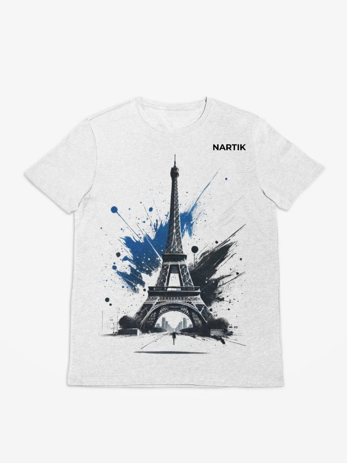 Questa non è solo la Torre Eiffel. È il simbolo di chi osa salire, di chi si espone, di chi non sta fermo. La silhouette iconica si mescola con schizzi urbani e caos creativo, come un battito artistico che esplode sul petto.